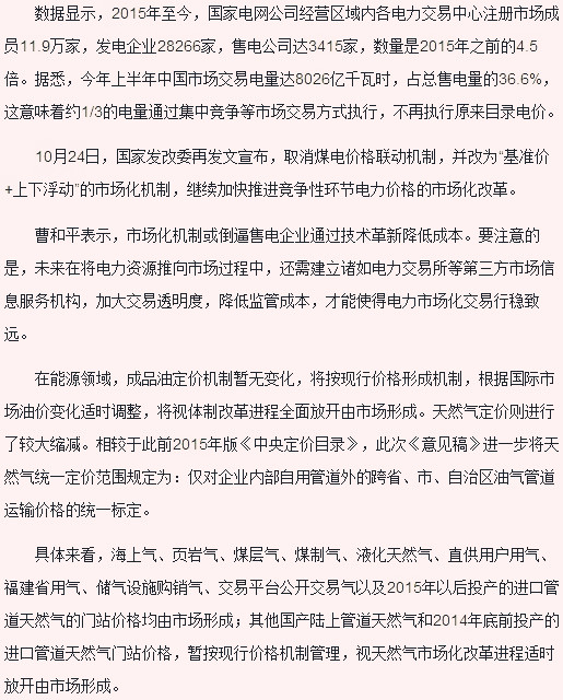 小編了解到,目前國(guó)內(nèi)的天然氣、成品油、電力等市場(chǎng)化的定價(jià)改革將要更進(jìn)一步。11月份,國(guó)家發(fā)展和改革委員會(huì)發(fā)布了《中央定價(jià)目錄》的意見征求稿,此次意見稿將針對(duì)15年的《中央定價(jià)目錄》進(jìn)行全面的修改和整理,在該基礎(chǔ)上將定價(jià)的項(xiàng)目減少到16個(gè)左右,除了保留基礎(chǔ)交通運(yùn)輸、重大水利工程供水、油氣管道運(yùn)輸、重要郵政服務(wù)、輸配電、重要專業(yè)服務(wù)、特殊藥品及血液等七種民生服務(wù)項(xiàng)目,對(duì)于電力、天然氣、部分交通運(yùn)輸領(lǐng)域的一部分定價(jià)項(xiàng)目進(jìn)行調(diào)整,本次的市場(chǎng)化定價(jià)機(jī)制改革或?qū)⒌贡茋?guó)內(nèi)大量的售電公司通過(guò)技術(shù)改革和創(chuàng)新來(lái)降低銷售成本進(jìn)而提高企業(yè)利潤(rùn)。