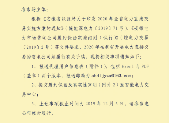 下面具體看一下安徽省電力交易中心關(guān)于售電公司提交明年履約保函的通知內(nèi)容: